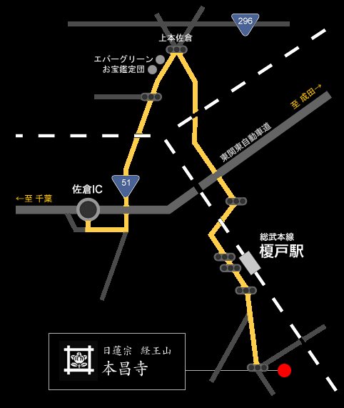 東関東自動車道・佐倉ICより国道51号を成田方面に上本佐倉交差点を右折、道なりに進み榎戸駅通過、直進後交差点を左折