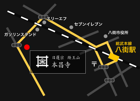 総武本線・八街駅下車北口、八街市役所を左に道なりに線路ぎわ直進後眼鏡市場を左折、線路を渡り直進
